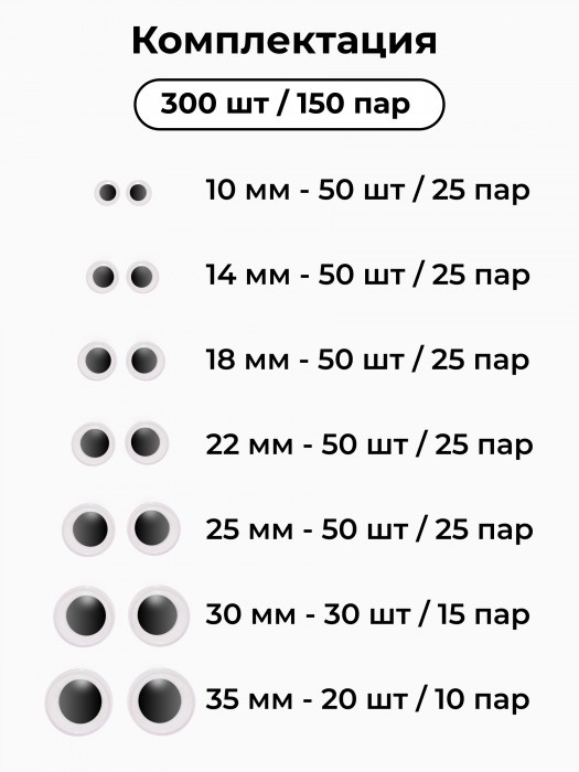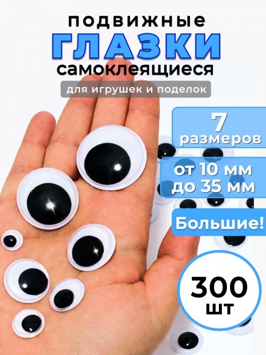 Глазки клеевые для игрушек самоклеящиеся (300 штук, 10/14/18/22/25мм по 50шт, 30мм-30шт, 35-20шт) 266217