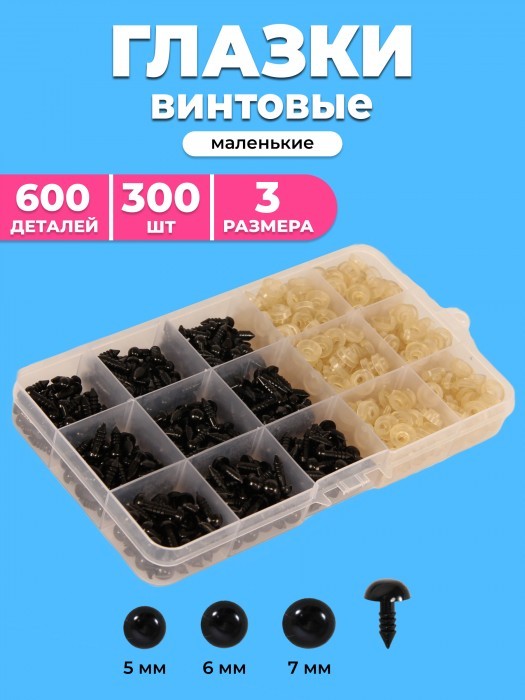 Глазки винтовые черные с фиксатором (300 штук-5мм, 6мм, 7мм/300 фиксаторов) 265559