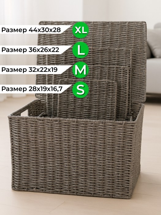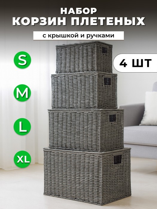 Корзина плетеная с/крыш КОМПЛЕКТ 4шт (S, M, L.XL) + иск/ротанг, серый 266235