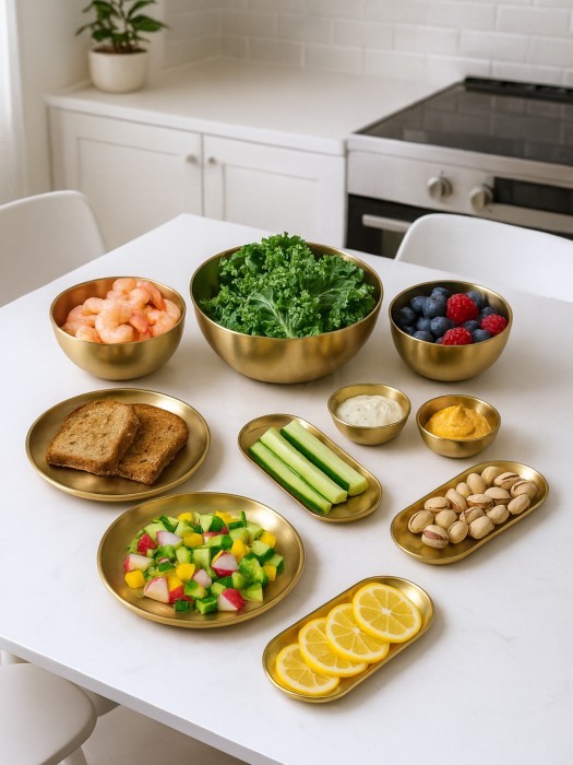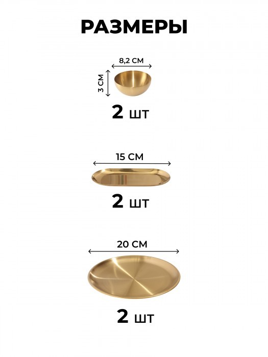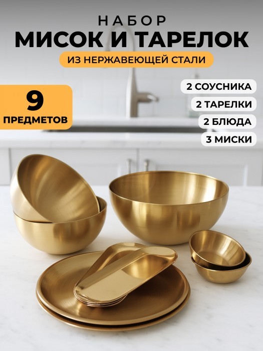 Набор Мисок из нержавеющей стали 9пред (15см- 2шт+20см-1шт+тарел 20см-2шт, бл.овал 18см-2шт, соус-2шт) золото 266206