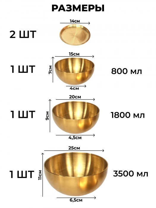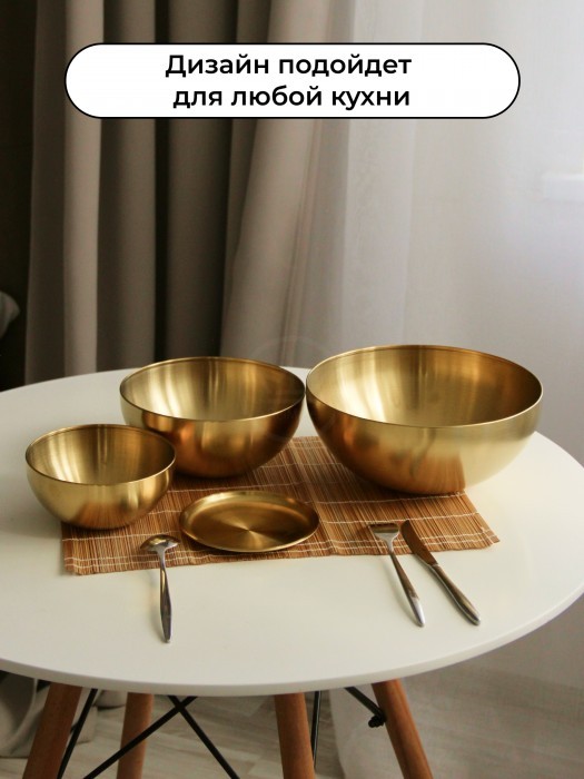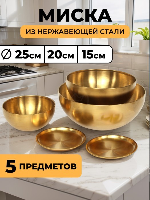 Набор Мисок из нержавеющей стали 5пред (15см, 20см, 25см-по 1шт+блюдце 14см - 2шт) золото 262427