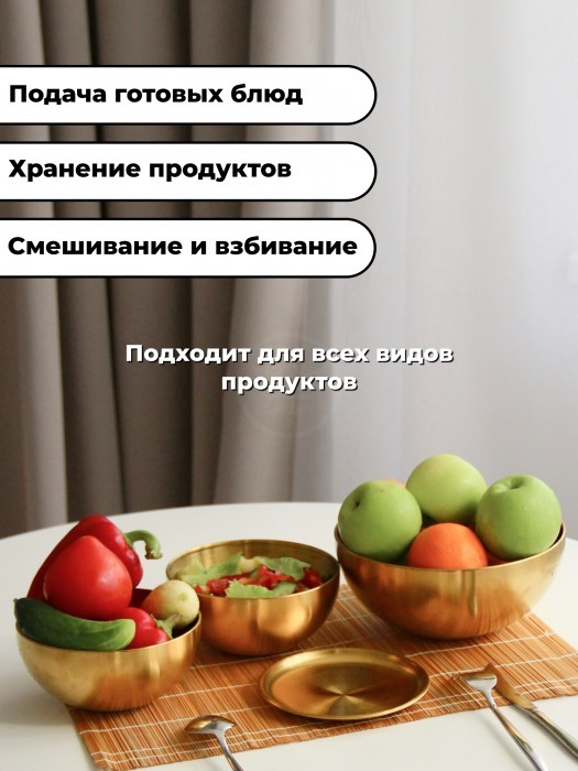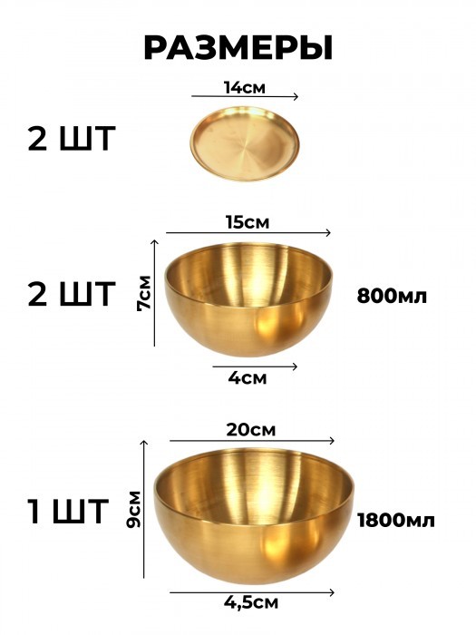 Набор Мисок из нержавеющей стали 5пред (15см- 2шт+20см-1шт+блюдце 14см-2шт) золото 262428
