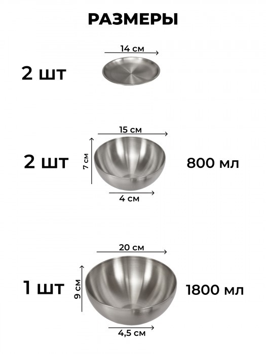 Набор Мисок из нержавеющей стали 5пред (15см- 2шт+20см-1шт +блюдце 14см-2шт) серебро 263334