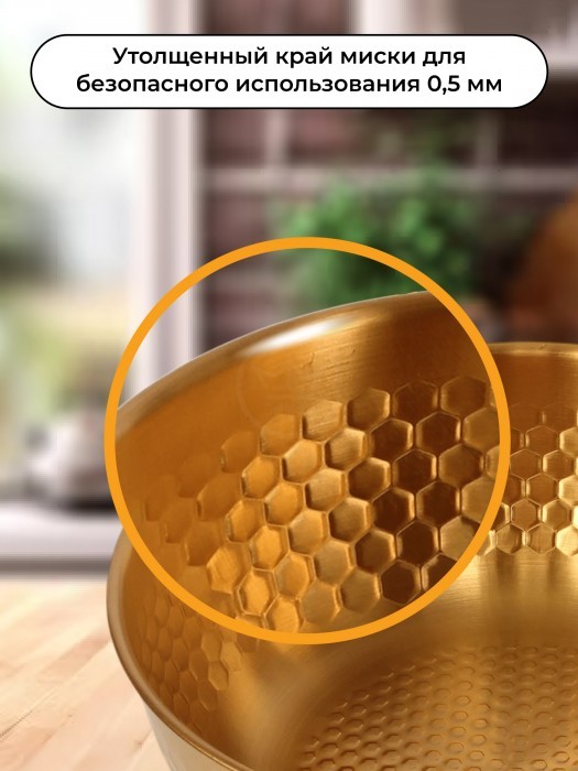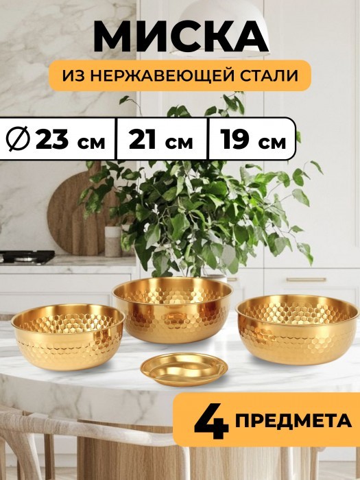 Набор Мисок из нержавеющей стали (соты) 3шт (19см-1шт+21см-1шт+23см-1шт+менажница 14см) золото 265526