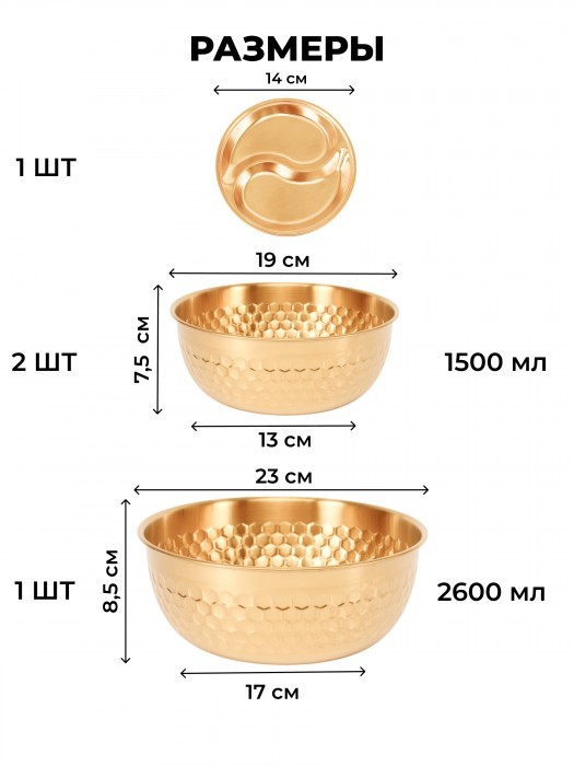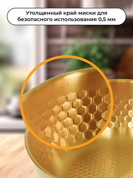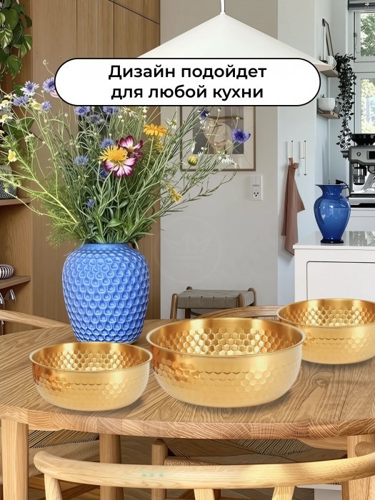 Набор Мисок из нержавеющей стали (соты) 3шт (19см-2шт+23см-1шт+менажница 14см) золото 265527