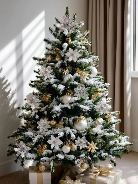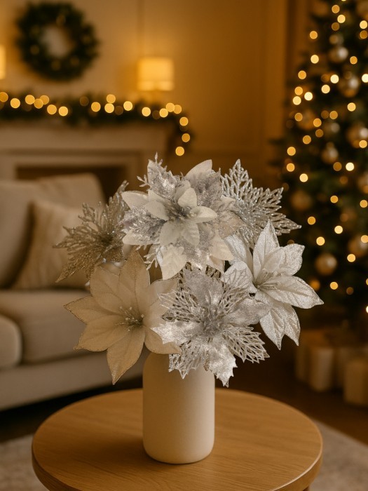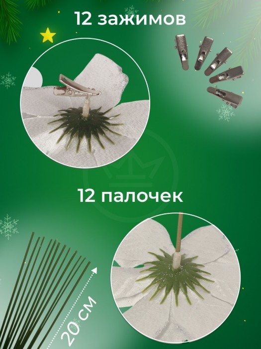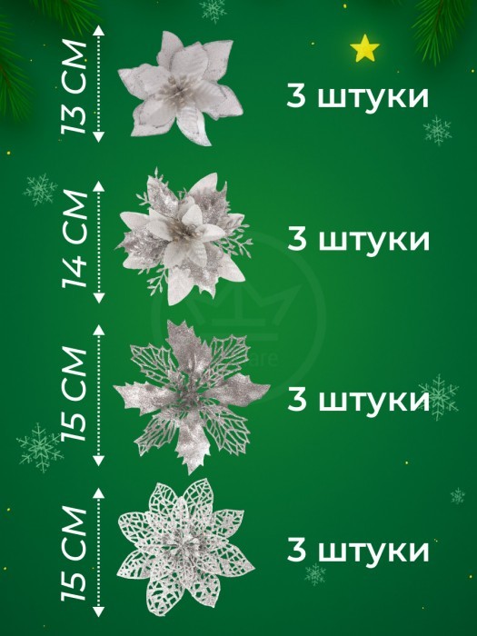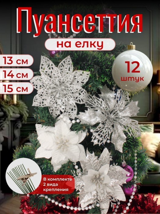 Набор Цветы Пуансеттия (12 штук - 13/14/15 см + проволока+зажимы) серебро 266219