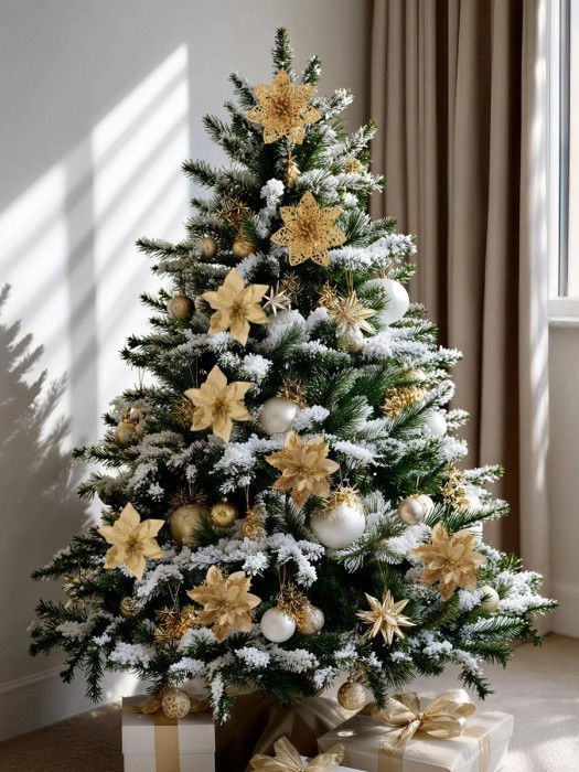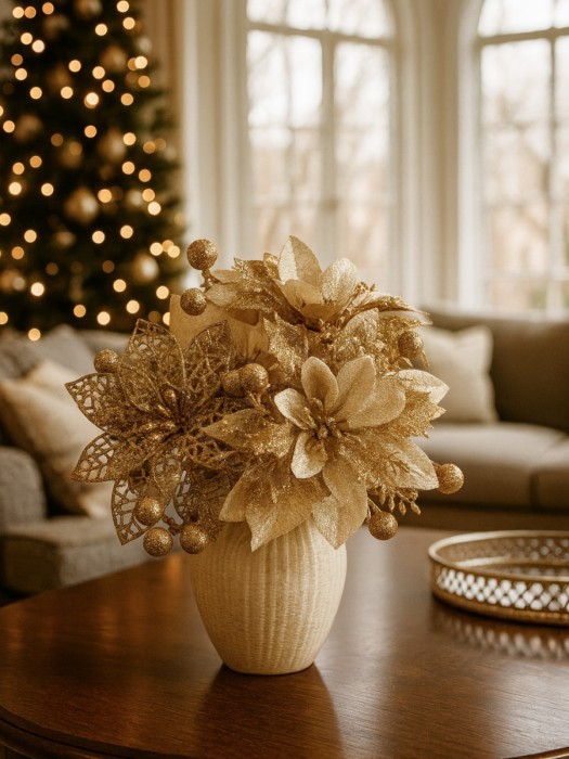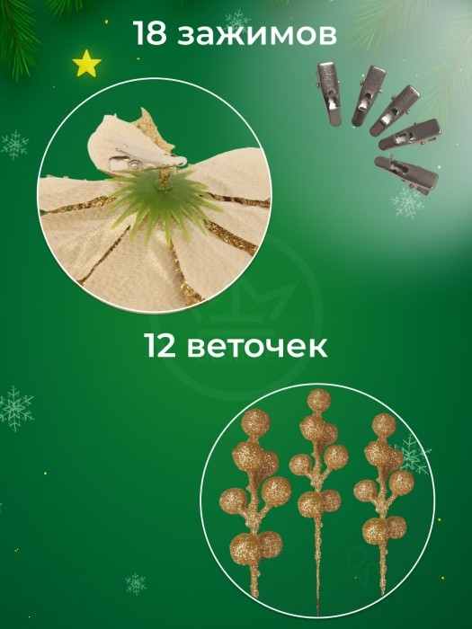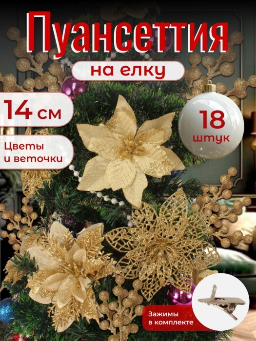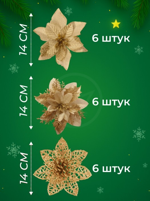 Набор Цветы Пуансеттия (18 штук - 14 см + веточки+зажимы) золото 266220