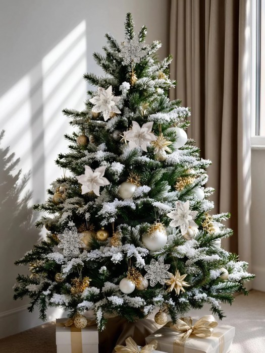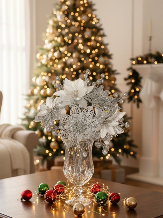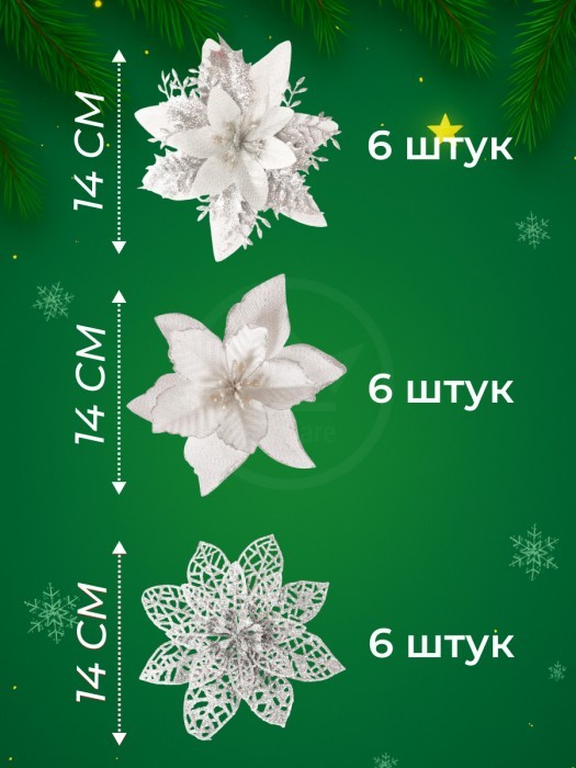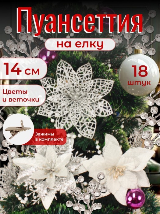 Набор Цветы Пуансеттия (18 штук - 14 см + веточки+зажимы) серебро 266221
