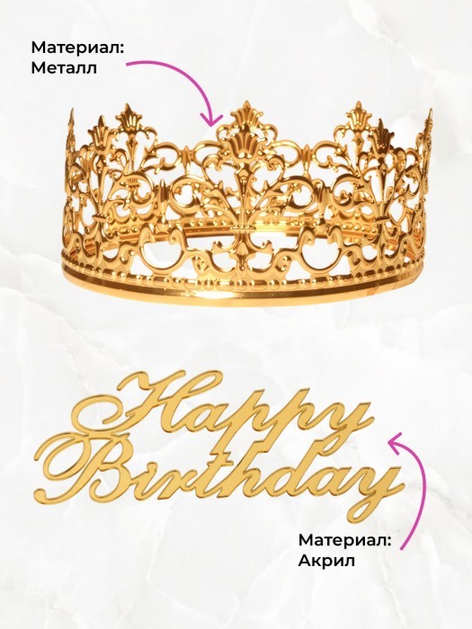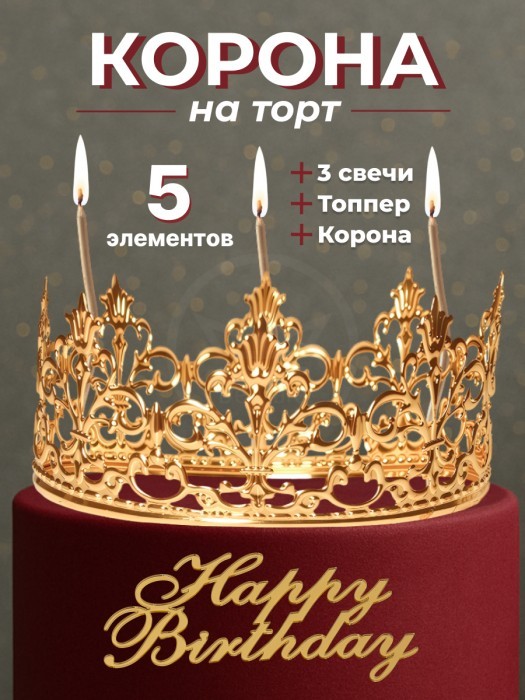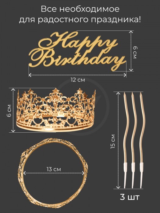 Корона на торт золотая+топпер Happy birthday (1шт) +Свечи (3 шт), золото 266160