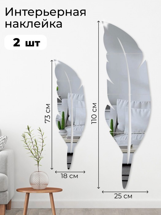 Интерьерные зеркальные наклейки Перо 2шт (110*25см-1 шт 73*18см-1шт) серебро 265534