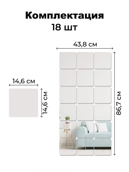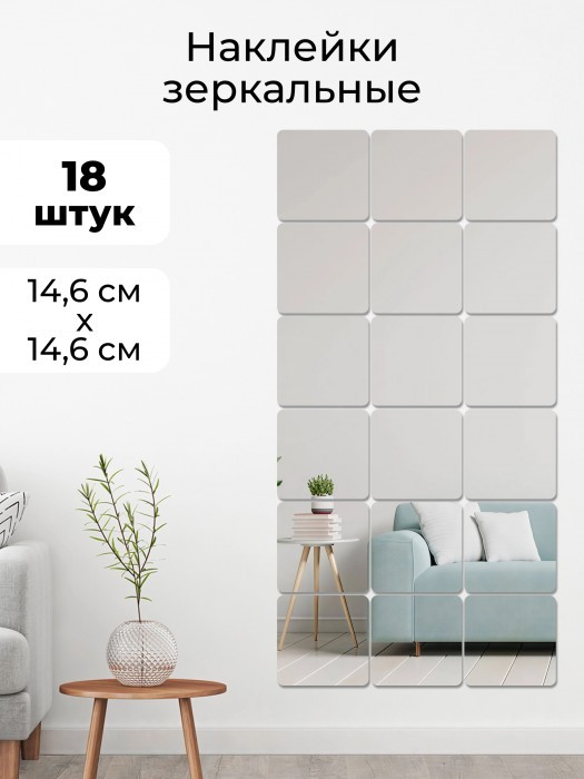 Интерьерные зеркальные наклейки Квадрат 18 шт ( 15*15 см, толщина 1мм) скругленные углы 265990