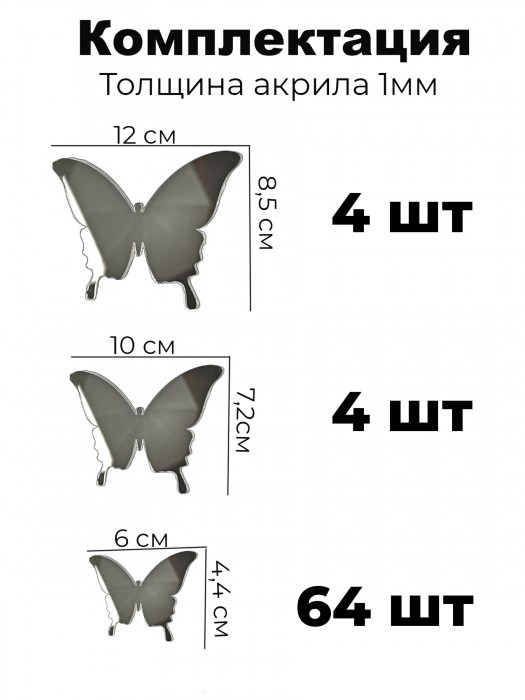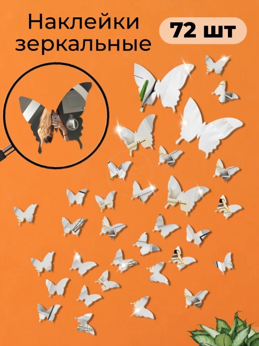 Интерьерные зеркальные наклейки Бабочки-2 набора ( 72 штук ) серебро 266107